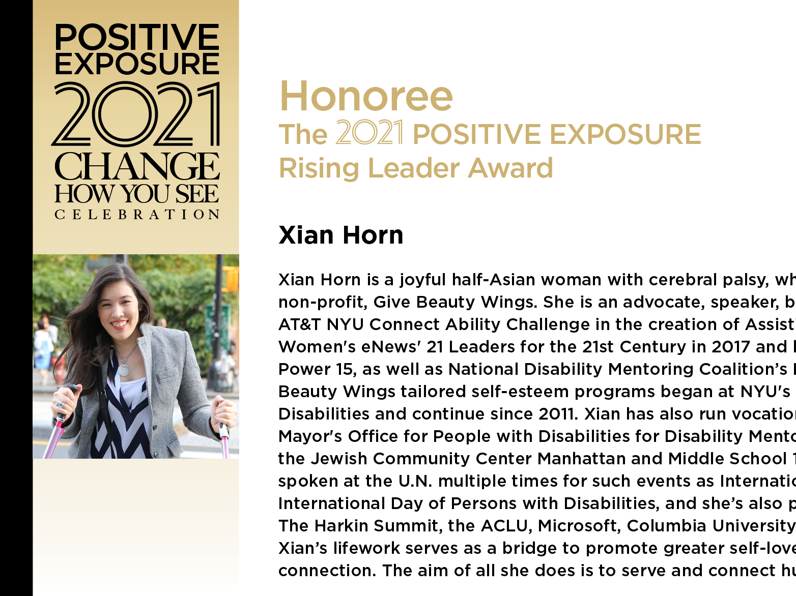 Xian has been featured in The White House Blog’s Women Working To Do Good series, NPR, Forbes, Fortune, Fast Company, Bloomberg, Barnard Center for Research On Women, NBC News, Yahoo News, Fox 5 and NY1, among others. Xian starred in the Starlight Children’s Foundation’s PSA, and Give Actually campaign. Xian was named Women’s eNews’ 21 Leaders for the 21st Century, honored in Walker’s Legacy Power 15 and National Disability Mentoring Coalition’s Hall of Fame, and will receive the 2021 Positive Exposure Rising Leader award.